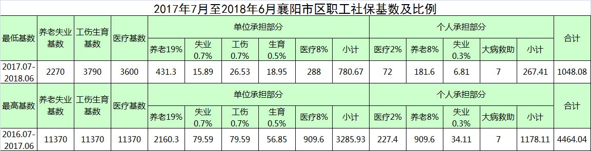 :1、個人基數(shù)以員工本人上年月均工資為基礎,十舍五入保留至十元位,但不得高于2015年度襄陽市社平月工資3560元的300%,養(yǎng)老保險和失業(yè)保險基數(shù)不得低于社平工資的60%,工傷保險和失業(yè)保險基數(shù)按社平工資3790計算,醫(yī)療險基數(shù)按社平工資的95%。
